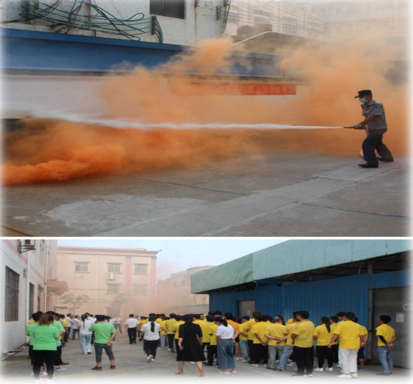10月29日下午4:30,一股黄色的浓烟从一楼仓库窜起(烟雾弹),接着全厂的火警警铃急促响起,同时反应敏捷的前台立刻发出广播:各位员工请注意,因发生紧急情况,请各位遵从安全指挥小组的指挥,立即有序疏散到一楼安全区域!!!(三遍)原本预计五分钟内疏散所有的员工,结果不到四分钟时间,所有员工已在安全区整齐地排着队点检人数了,由此看来,我们的有序疏散是高效的、有纪律性的。