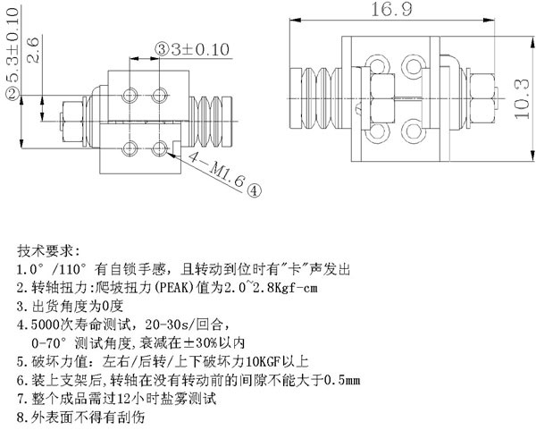 头戴耳机转轴技术要求: 1.0°/110°有自锁手感,且转动到位时有"卡"声发出 2.转轴扭力:爬坡扭力(PEAK)值为2.0-2.8Kgf-cm 3.出货角度为0度(凸包在凹槽里) 4.5000次寿命测试,20-30次/分钟, 0-115°测试角度,折叠测试后功能无明显异常 5.整个成品需过8小时盐雾测试 6.外表面不得有刮伤 |