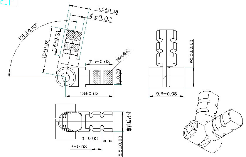 包装盒阻尼转轴技术要求 1、光洁无毛剌,电镀等级:48小时中性盐雾; 2、所有材料符合欧洲ROSH环保标准; 3、出厂前调整好扭力值要求2.5KGF*CM±0.3,寿命8000次以上. 4、 其它倒角均为0.1mm | |